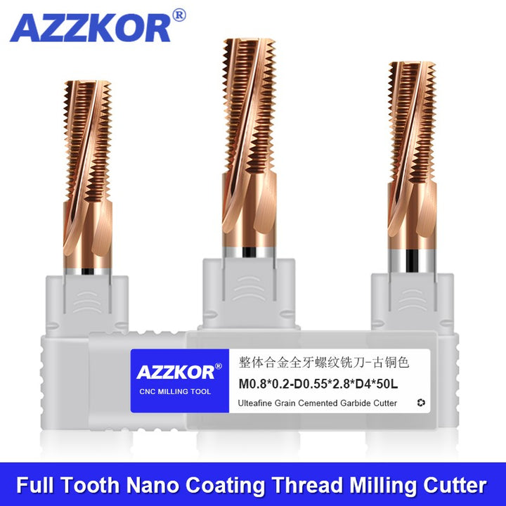 AZZKOR HRC58 Thread Milling Cutter Tungsten Steel Carbide Nano Coating Full Teeth Milling Cutter CNC Machining Center Tools
