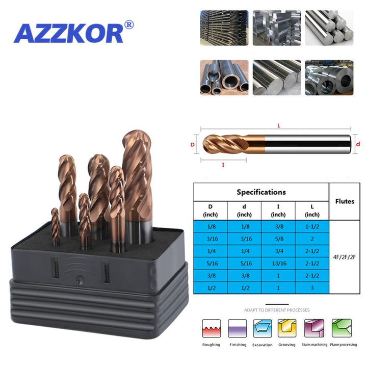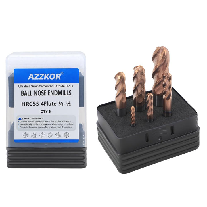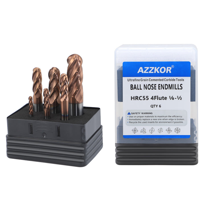 Carbide Ball Nose Inch EndMill HRC55 Double Edge 4 Flute TiSlN Coating Tungsten Steel Milling Cutter for Metal Steel 1/8,3/16,1/4,5/16,3/8,1/2 Series 6pcs Set