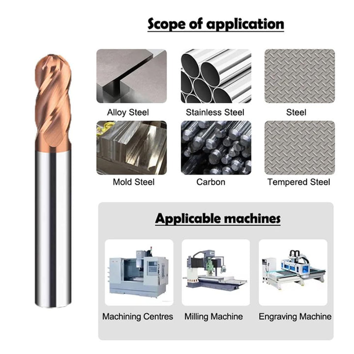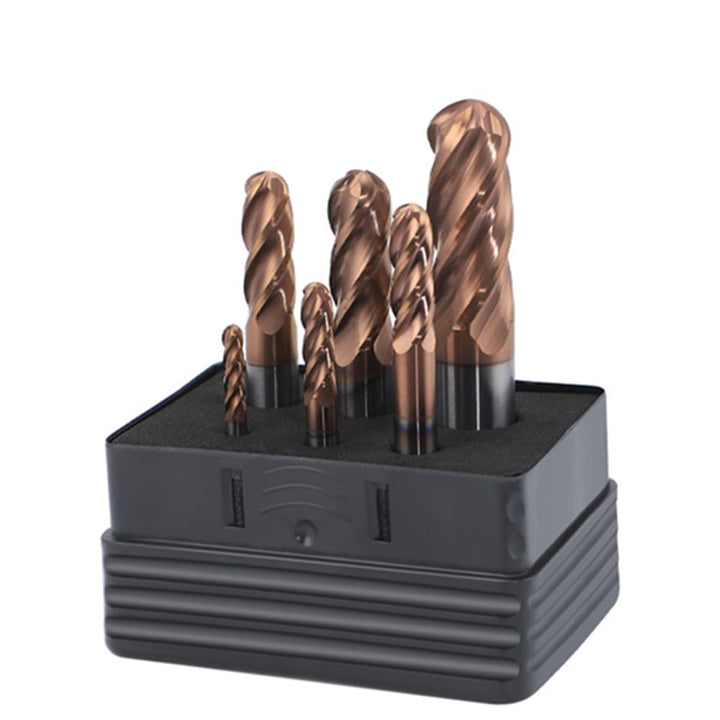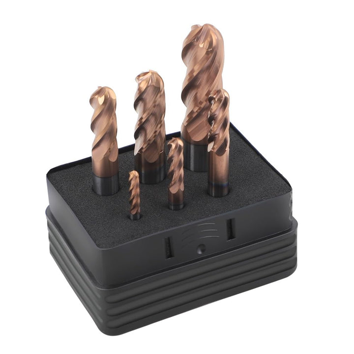 Elevate your machining precision with this comprehensive 6-piece ball nose end mill set. Each cutter features a double-edge, 4-flute design crafted from premium tungsten steel with a hardness rating of HRC55. The TiSlN coating enhances durability and cutting performance when working with metal and steel materials. This versatile set includes six essential sizes: 1/8", 3/16", 1/4", 5/16", 3/8", and 1/2", making it suitable for a wide range of milling applications. The ball nose design allows for smooth contour cutting and excellent surface finishes, while the four-flute configuration provides optimal chip evacuation and cutting efficiency. These end mills are ideal for professionals working in tool rooms, machine shops, and industrial manufacturing settings where precision and reliability are paramount.