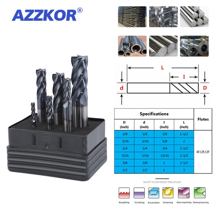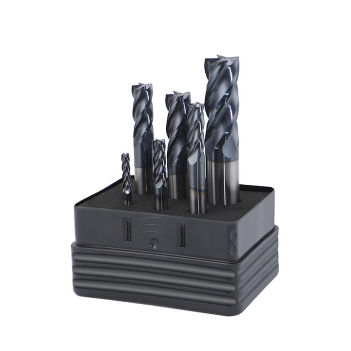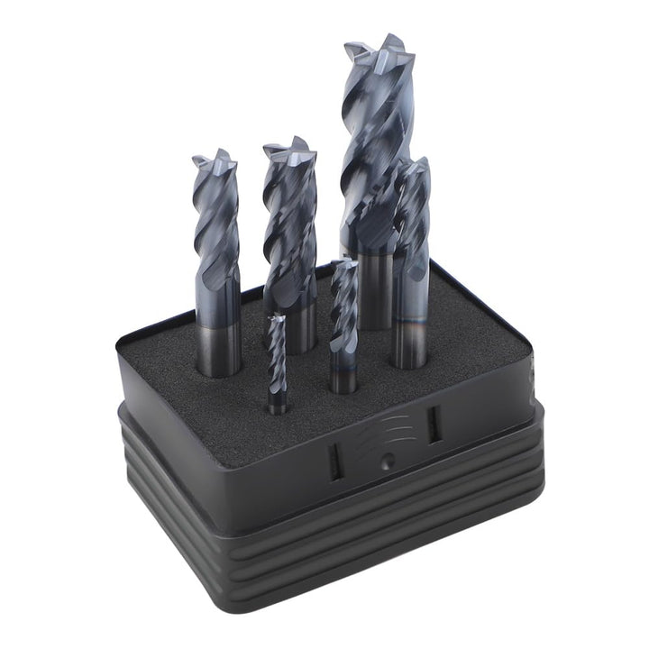 Elevate your machining capabilities with this premium 6-piece carbide end mill set. Featuring double-edge, 4-flute design and advanced TiAlN coating, these end mills deliver exceptional performance in metal and steel cutting applications. The set includes sizes ranging from 1/8,3/16,1/4,5/16,3/8,1/2 inch, offering versatility for various milling needs. Crafted from high-grade tungsten steel with HRC50 hardness, these tools ensure durability and precision in your cutting operations. The TiAlN coating enhances wear resistance and extends tool life while maintaining superior cutting efficiency. Perfect for professional machinists and industrial applications, this comprehensive set provides the essential sizes needed for common milling tasks. Each end mill is engineered to deliver clean cuts and excellent surface finish in metal working operations.
