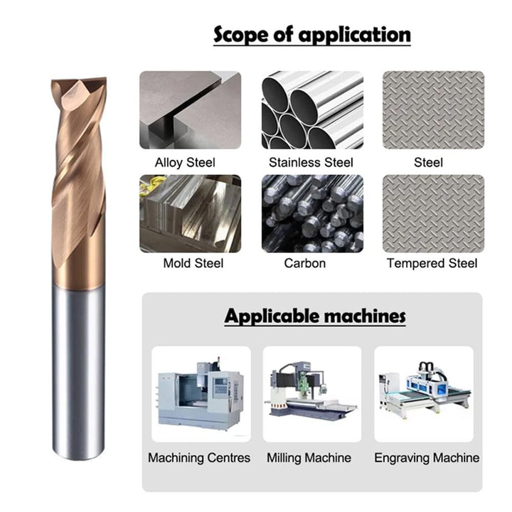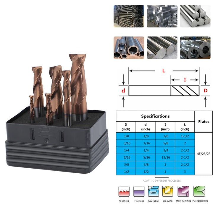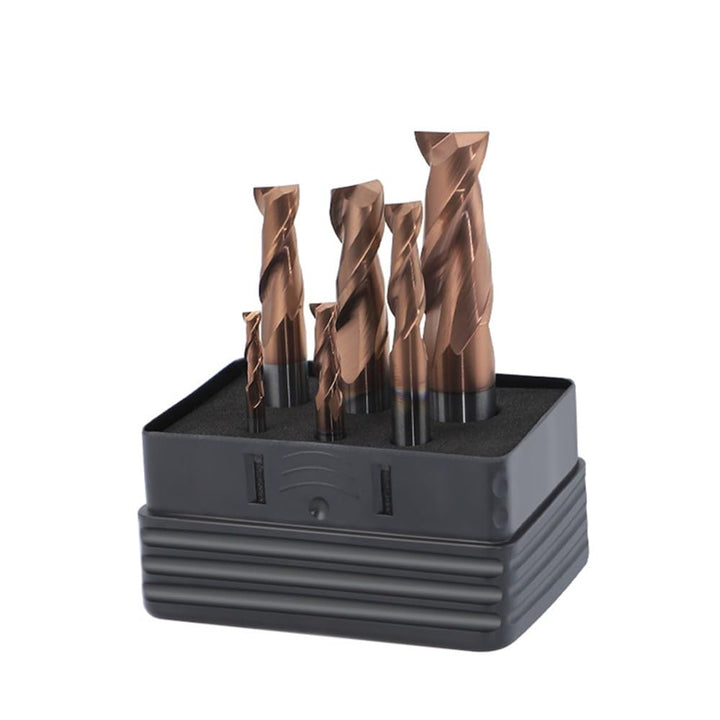 Elevate your machining precision with this comprehensive 6-piece carbide end mill set. Each tool features a robust HRC55 hardness rating and advanced TiSiN coating, delivering superior performance when working with metal and steel materials. The set includes essential sizes: 1/8", 3/16", 1/4", 5/16", 3/8", and 1/2", covering a wide range of milling applications. The double-edge, 2-flute design ensures smooth cutting action and excellent chip evacuation. Crafted from premium tungsten steel, these end mills provide outstanding wear resistance and cutting efficiency. Perfect for professional machinists and workshops handling various metalworking projects, this versatile set maintains accuracy and edge retention even during demanding operations. The TiSiN coating reduces friction and heat buildup, extending tool life while enabling higher cutting speeds.
