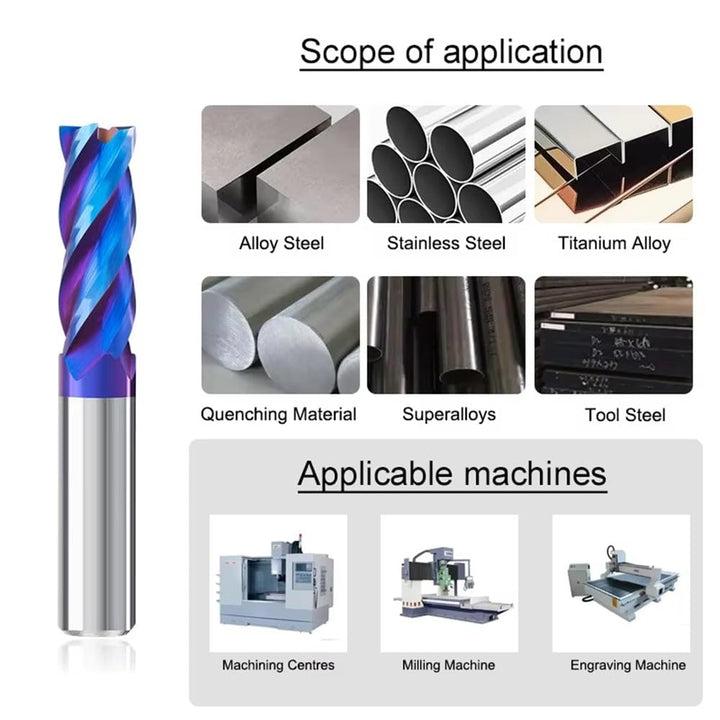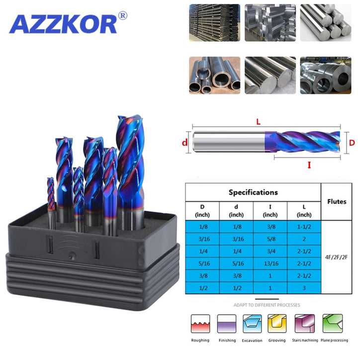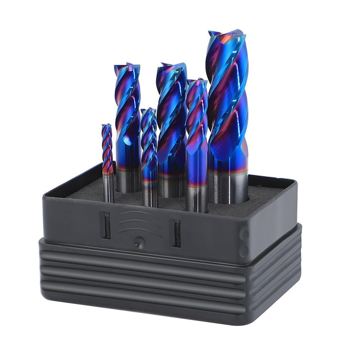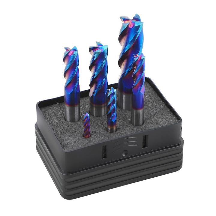 Elevate your machining capabilities with this premium 6-piece carbide end mill set. Each piece features a robust double-edge design with 4 flutes, crafted from high-grade tungsten steel and enhanced with NANO coating for superior performance. The set includes essential sizes: 1/8", 3/16", 1/4", 5/16", 3/8", and 1/2", making it versatile for various milling applications. With an impressive hardness rating of HRC65, these end mills excel in cutting metal and steel materials. The precision-engineered flutes ensure efficient chip evacuation and smooth cutting action, while the NANO coating helps maintain sharpness and extends tool life. Perfect for professional machinists and industrial applications, this comprehensive set delivers the precision and durability needed for demanding metalworking projects.